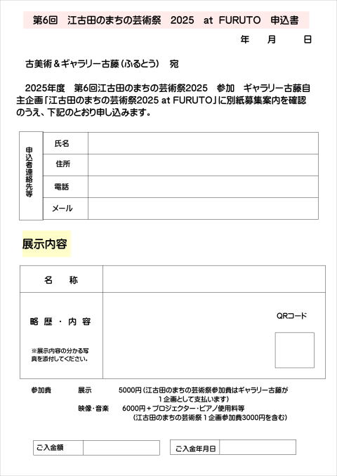 ギャラリー古藤自主企画参加者を募集 江古田のギャラリー古藤では、10月25日(土)〜11月3日(月)の期間に第6回江古田のまちの芸術祭2025の自主企画「第6回江古田のまちの芸術祭2025 at FURUTO」に出展いただける作家・クリエイターを募集することといたしました。 ■目的 「江古田をアートのまちにしたい!」とのスローガンで毎年江古田のまちで繰り広げられる2025年度第6回江古田のまちの芸術祭2025の自主企画としてギャラリー古藤で作品展示・上映・演奏を行うため。 ■対象者 ・指定の期間に作品発表・展示・上映・演奏を行える個人もしくはグループ。 ・絵画・写真・彫刻等展示期間内、在廊可能な方。(在廊日数は相談可) ・出展が決まった場合に、1-2度打ち合わせに来ていただける方。 ・審査時、実物を拝見し判断させていただく場合があり、その際に作品を持参いただける方。 ・準備から搬入搬出まですべて行える方。 ■募集人数 展示 8名〜12名 映像・音楽その他 4組〜7組 ■展示スペース ギャラリー内の壁面1人あたり幅約1〜2メートル位を予定、(最終参加者の人数によって変わります)天井高さ2.5メートル〜3メートル ギャラリー展示面は4つの壁面に分かれています。展示観覧時間 11時〜17時 ■上映・演奏スペース、 展示終了後 午後18時〜21時 ■対象ジャンル アート・美術作品、もしくは、クラフトや手仕事品、写真・デザイン・イラスト映像・音楽演奏など。 ■期間 10月25(土)〜11月3日(月) 10日間 展示 11時〜17時 (最終日は16時。搬出はその日の内に)【搬入日】10月24日(金)相談可能。 ※10月25日、11月3日夜はオープニングとクロージングイベントを優先します。 ※ なお、10月25(土)〜11月3日(月)10日間以外の日程に行われるイベントも希望があれば、江古田のまちの芸術祭参加イベントとします。(10月、11月) ■応募方法 展示プランや活動履歴、プロフィールがわかる資料と、ご連絡先を添えて、自由なフォーマットでお送りください。 メールにデータを添付(pdfや画像ファイルなど、合計5MBくらいまでにしてください)いただくか、郵送でギャラリー古藤までお送りください。 応募いただいた資料は返却いたしません。 ■応募先 メールの場合 fwge7555@nifty.com 郵送の場合 〒176-0006 東京都練馬区栄町9-16 ギャラリー古藤宛 ※なるべくメールでお送りください。 ■締切 2025年7月15日(火) 必着(メール、郵送ともに) *募集人数を越えた場合は事前に締切る場合があります。 ■審査 これまでのご経験、作品や展示プランの内容、ギャラリー古藤の空間とのマッチングなど考慮した上で決定いたします。 ■結果発表 2025年7月22日(火) ご本人にご連絡いたします。 *募集締め切りが早まった場合は、結果発表の日時の前にご連絡いたします。 ■費用 参加費は展示作品はギャラリー使用料として1スペース5000円。 DMの印刷など、各自展示の準備に必要な費用はご負担ください。 ※